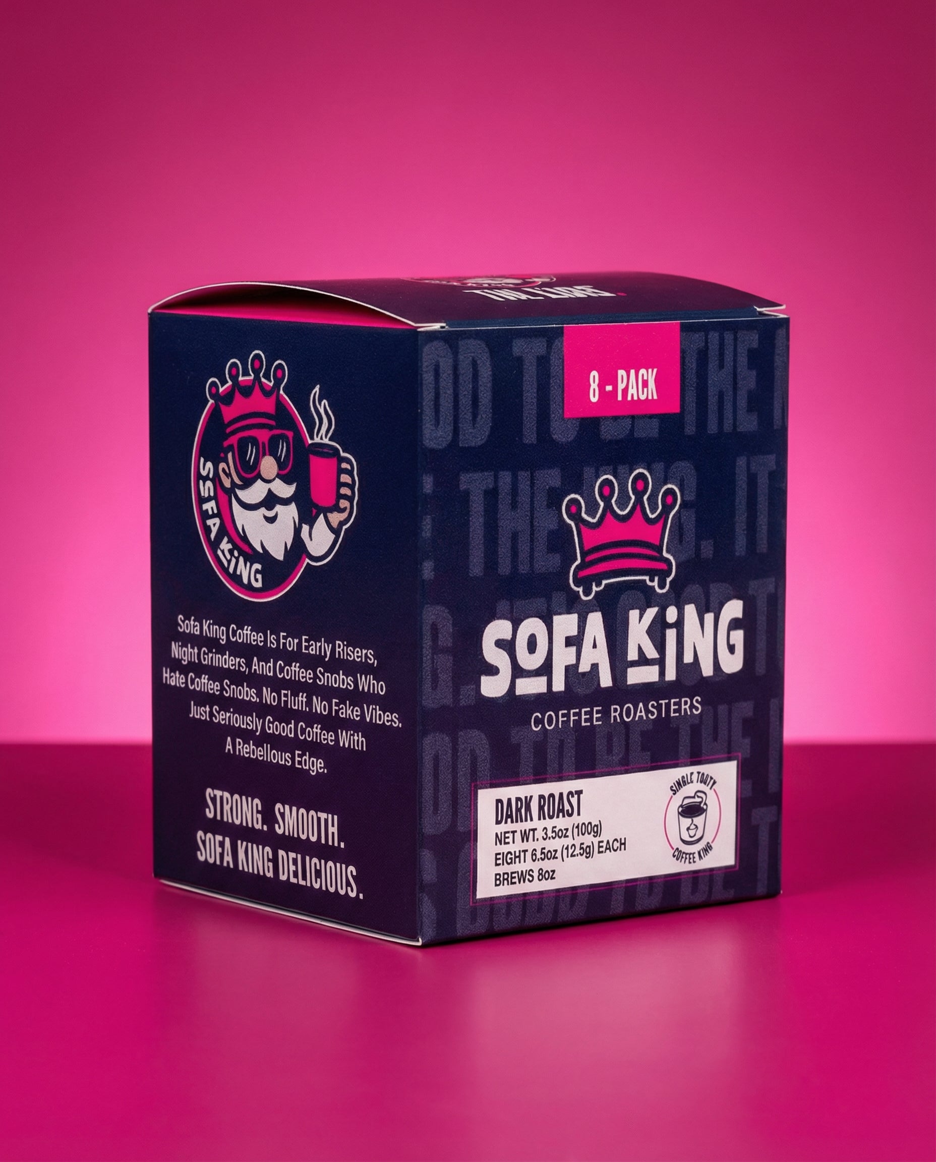 Dark Roast. Single serving coffee sachets. Perfect for on the go. Travel-friendly quick and easy coffee. Take Sofa King coffee with you and make your brew simple with our Pour Ta.